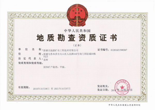 新疆天地源地勘公司成立于2004年,历经十余年的发展,现持有地质勘查甲级资质和ISO9001:2008质量管理体系认证证书。